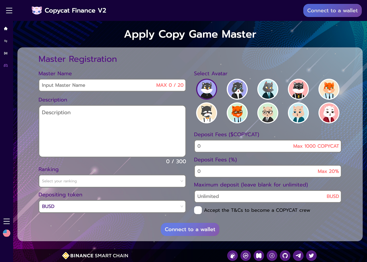 Let’s start by applying to be a Copy Game Master (https://v2.copycat.finance/applycopygame)